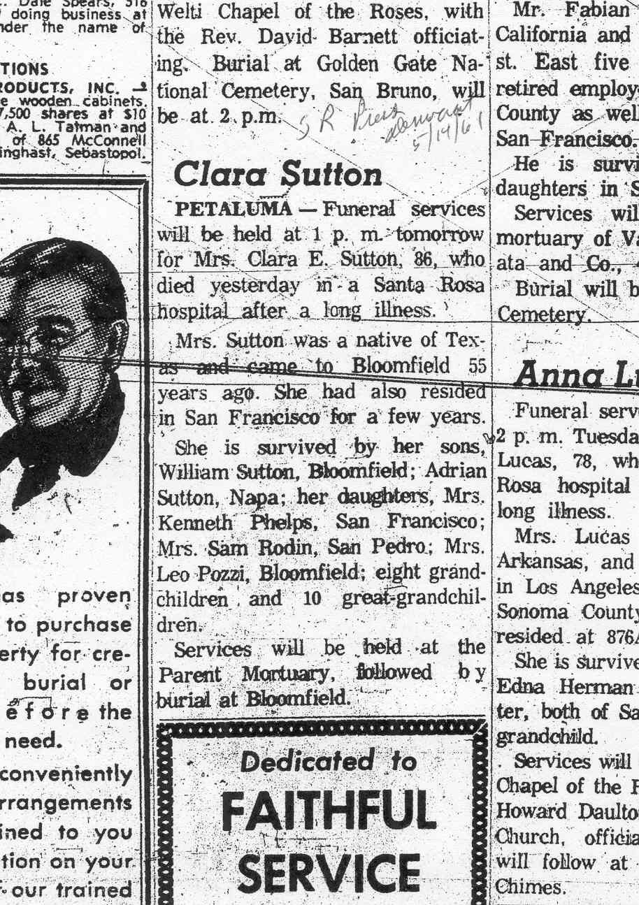 Obit in Santa Rosa Press Democrat, May 14, 1961